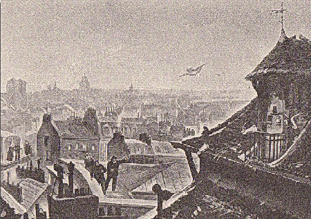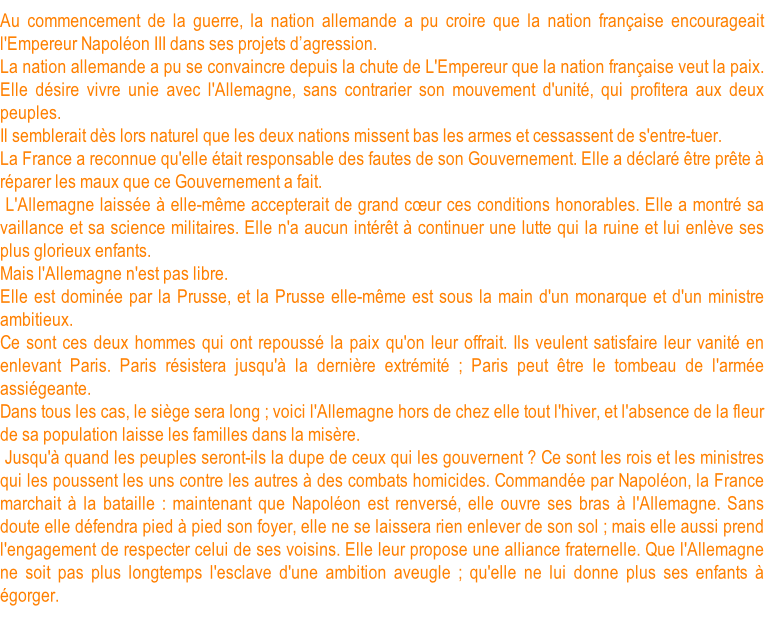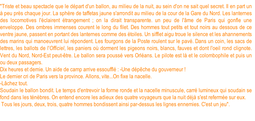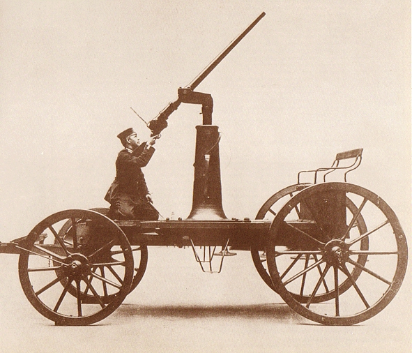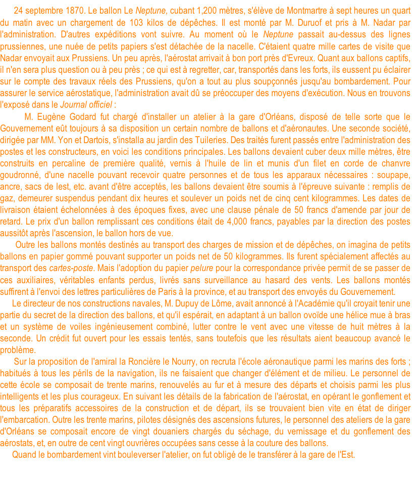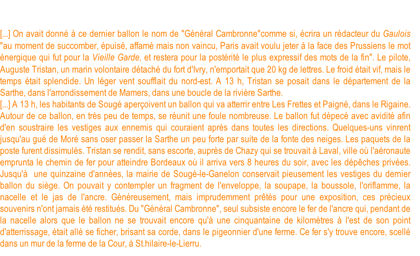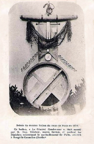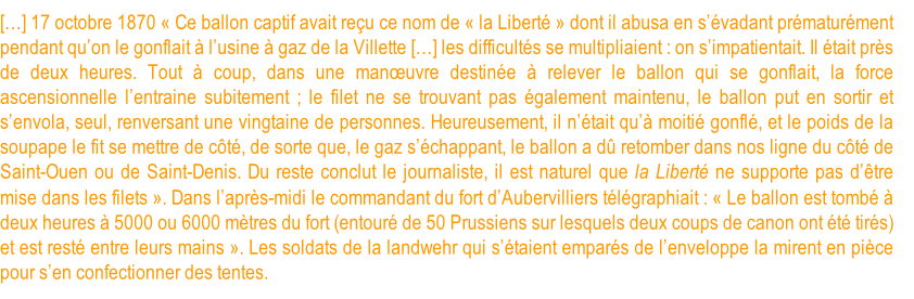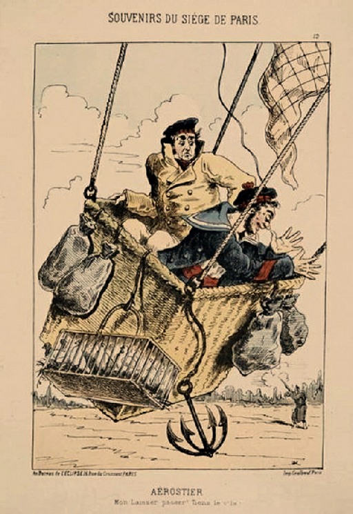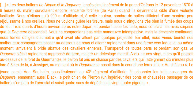 [...] On venait d’apprendre que les Prussiens, consternés de voir les courriers de l’air défier leurs armes à feu, passer si librement à quelques miliiers de mètres au-dessus de leurs lignes d’investissement, étudiaient sérieusement les moyens d’arrêter les trops audacieux ballons. L’illustre Krupp construisit un engin spécial déstiné à atteindre les esquifs de l’air, admirable canon dont on attendait merveille. Ce gun balloon fut promené triomphalement dans les rues de Versailles ; c’était une longue bouche à feu, mobile autour d’un axe, ressemblant bien plus à un téléscope qu’à un canon. Les soldats de Bismarck disaient tout haut qu’ils allaient abattre les aérostats comme des perdrix, mais le grand canon destiné à la chasse aux ballons, fit plus de bruit que de besogne. L’ennemi organisa bientôt, d’autre part, un système d’observations régulières. Quand un ballon sortait de Paris, des sentinelles examinaient la route qu’il suivait, et, par le télégraphe, prévenaient les postes prussiens situés dans la ligne probable du voyage. Des uhlans, prévenus à temps, couraient la tête en l’air, l’oeil braqué dans le ciel, et s’efforçaient d’arriver au moment de la descente. (Extrait de “Souvenirs d’un aérostier militaire de l’armée de la Loire” de Gaston Tissandier).