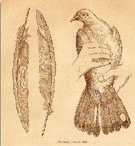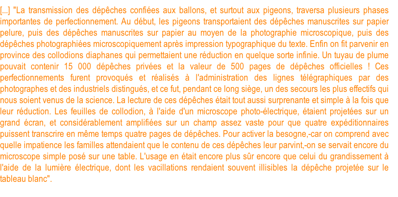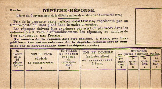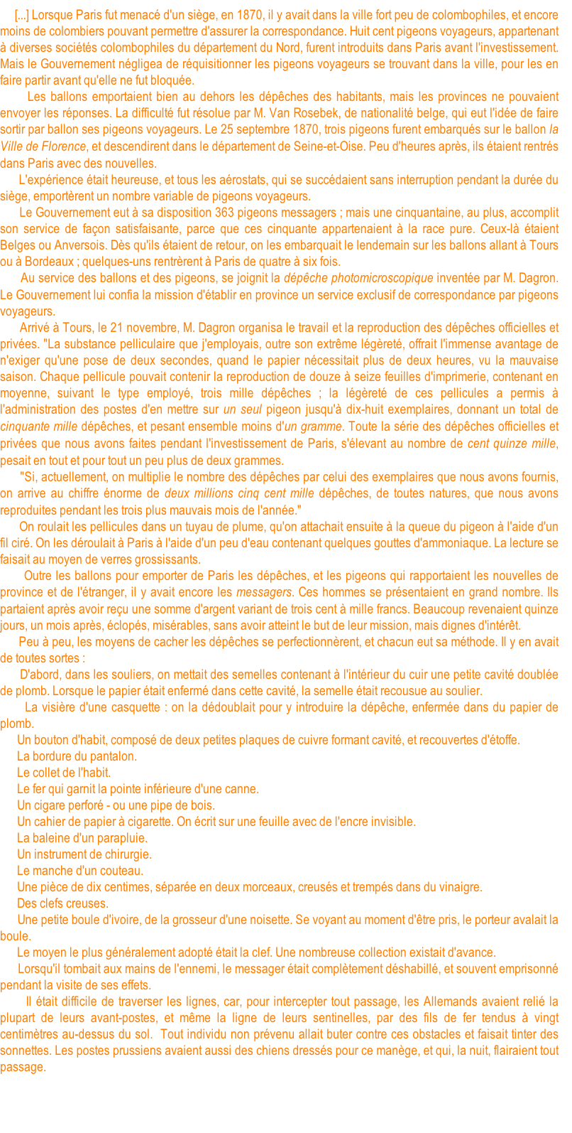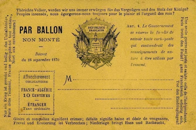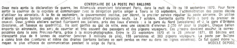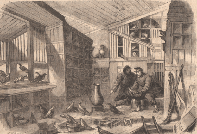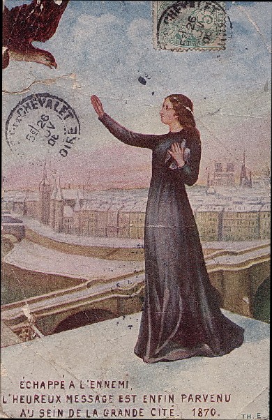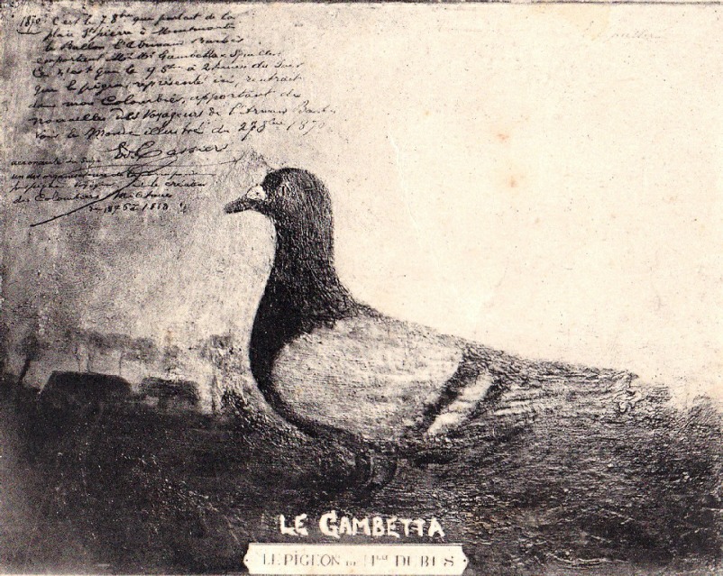 1870. C’est le 7 8bre que partait de la place St. Pierre à Montmartre le ballon l’Armand Barbès emportant Mrs. Gambetta et Spuller. Ce n’est que le 9 8bre à 2 heures du soir que le pigeon représenté ici, rentrait dans mon colombier, apportant des nouvelles des voyageurs de l’Armand Barbès. (Texte de cette image).