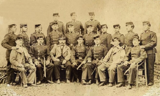De haut en bas, "faschinenmessers" saxon modèle 1845,  prussien modèle 1864 et wurtembergeois.  Ci-dessous groupe de soldats wurtembergeois équipés de cette arme. Retour