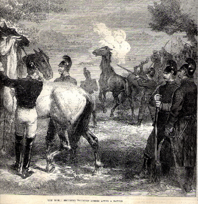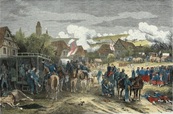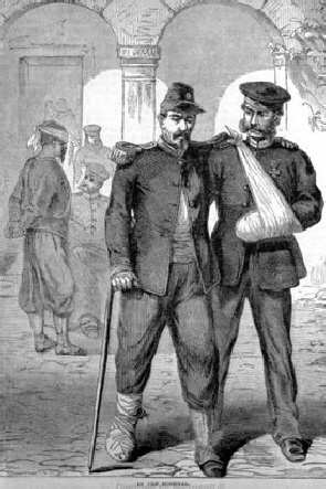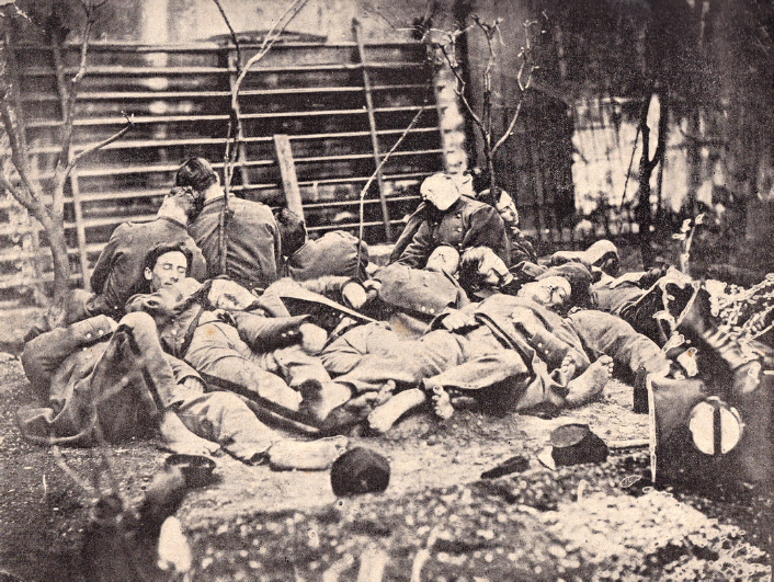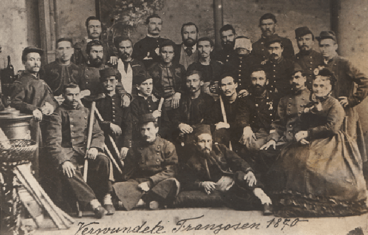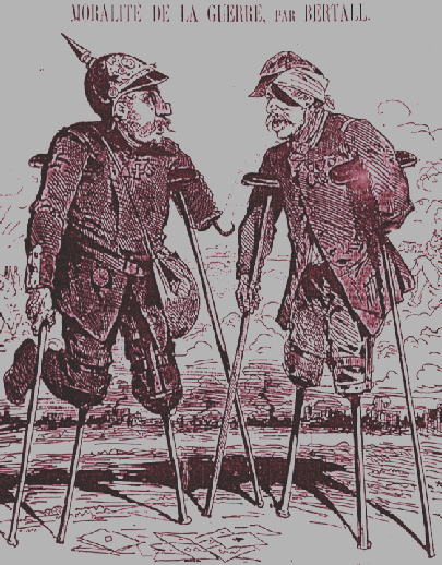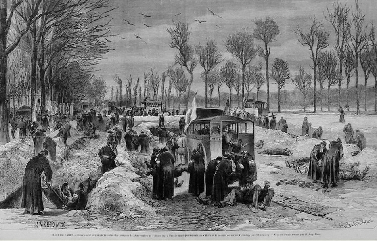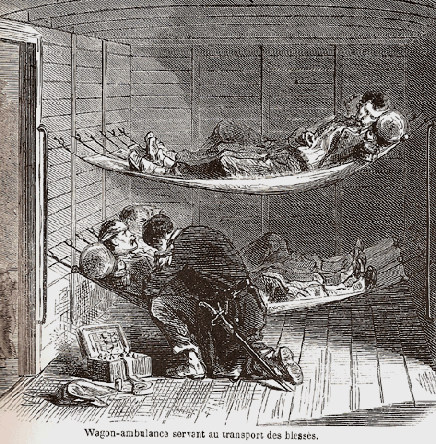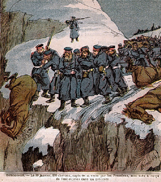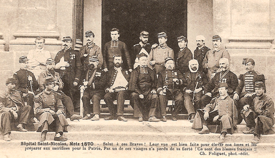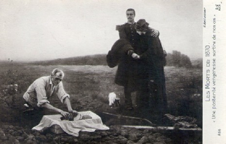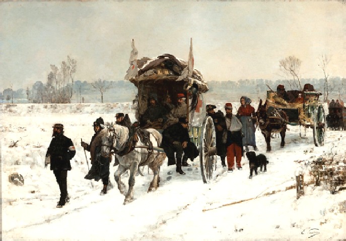 Ambulance militaire à Bischwiler après la bataille de Froeschwiller. Wagon-ambulance servant au transport des blessés. Charleville.- La dernière ambulance (allemande) établie au Petit-Bois pendant la guerre de 1870-71. La mairie de Fontenay-aux-Roses transformée en ambulance allemande. Ambulance allemande à Wissembourg. Les soeurs de la charité à l'ambulance de la Croix Rouge après la bataille de Gravelotte. Un hôpital ambulant à Froeschwiller. Hôpital Saint-Nicolas, Metz 1870. Salut à ces Braves ! Leur vue est bien faite pour élever nos âmes et les préparer aux sacrifices pour la Patrie. Pas un de ces visages n'a perdu sa fierté ! Ce sont des blessés français !! "A l'ambulance" gravure anglaise de l'époque. Après la bataille de Saint-Privat. Ambulance allemande. Convoi de blessés. Tableau de Edouard Castre (Milwaukee Art Museum) Voyez un rare article sur un mutilé de la guerre de 1870 :  http://danis-assy.blogspot.com/2009/01/au-combat-dpernon-le-4-octobre-1870.html "Hé bien mon pauvre Choucroutman ! Hé bien mon pauvre Chauvin ? C'est fini de jouer : tu as gagné un empereur, moi j'en ai perdu un. Et ça ne nous rend pas la jambe mieux faite" On estime que les pertes humaines de la guerre de 1870-71 se sont élevées  à : 147 000 morts, 128 000 blessés et 100 000 malades pour l'Allemagne,  139 000 morts,  143 000 blessés  et  320 000 malades pour la France. Chevaux français capturés à Sedan. Abattage des chevaux prisonniers après la bataille. Gravure de "The Illustrated London New"du 8 oct. 70. Sombacourt.- Le 30 janvier, 200 chevaux, capturés la veille par les Prussiens, sont tués à coups de fusil et jetés dans un précipice. Chevaux retirés de fossés après la capitulation de Metz. Retour vers le menu Retour vers la page d'accueil Guillaume 1er et de Moltke  en visite  au château de Versailles transformé en hôpital allemand. Gardes mobiles tués sur le champ de bataille de Châtillon,19 septembre 1870. (Légende de cette photo). Un ambulance photographiée en 1871. Ambulance française utilisée en 1870. Une ambulance au siège de Paris