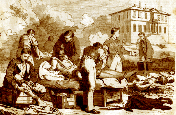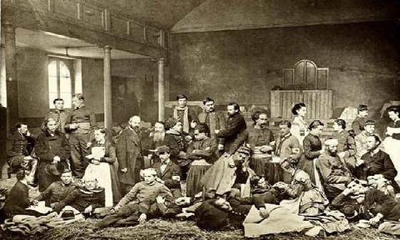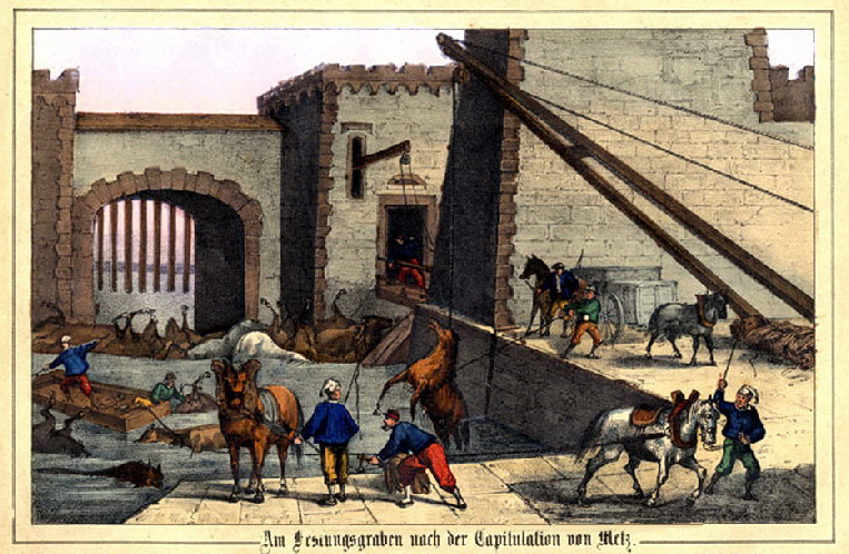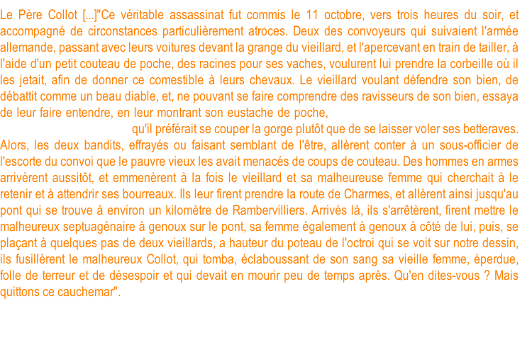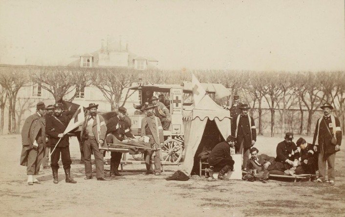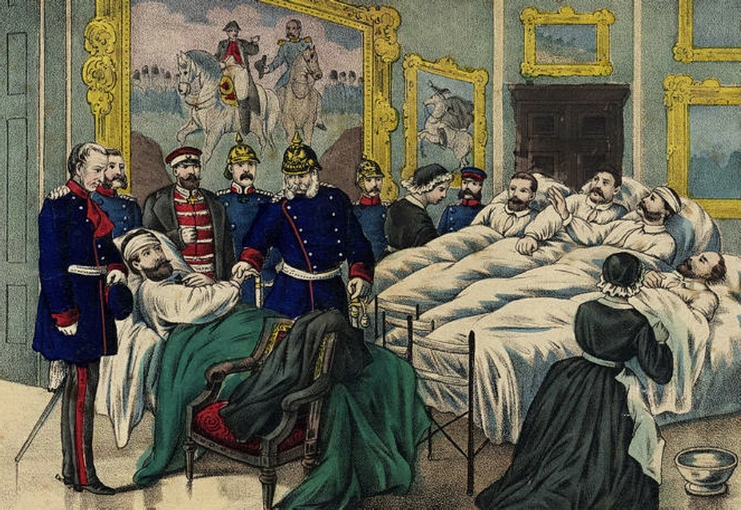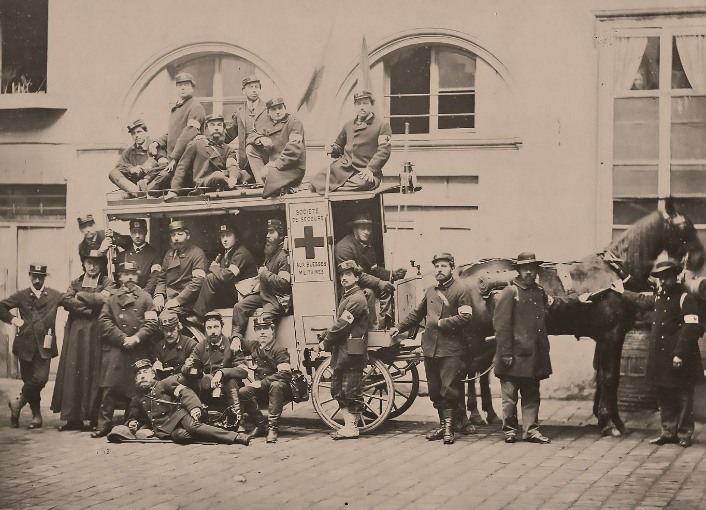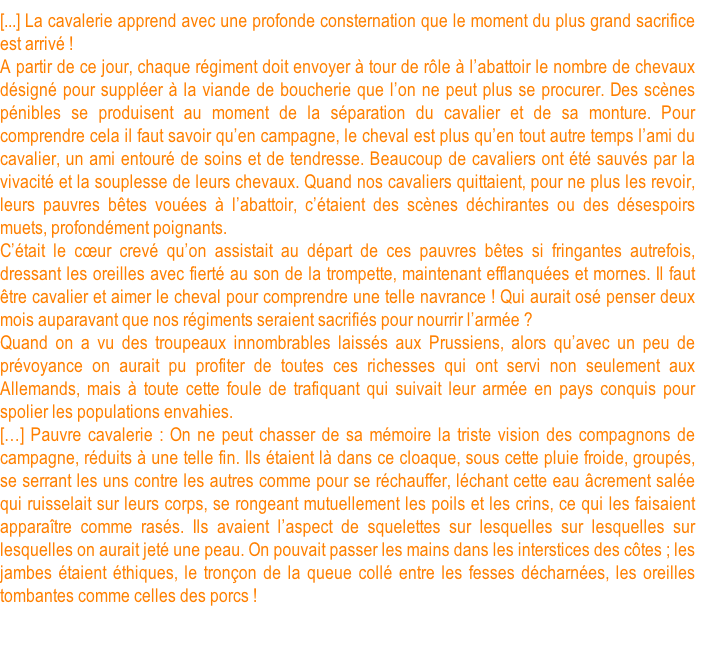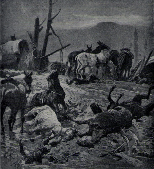 Ambulance militaire à Bischwiler après la bataille de Froeschwiller. Wagon-ambulance servant au transport des blessés. Charleville.- La dernière ambulance (allemande) établie au Petit-Bois pendant la guerre de 1870-71. La mairie de Fontenay-aux-Roses transformée en ambulance allemande. Ambulance allemande à Wissembourg. Les soeurs de la charité à l'ambulance de la Croix Rouge après la bataille de Gravelotte. Un hôpital ambulant à Froeschwiller. Hôpital Saint-Nicolas, Metz 1870. Salut à ces Braves ! Leur vue est bien faite pour élever nos âmes et les préparer aux sacrifices pour la Patrie. Pas un de ces visages n'a perdu sa fierté ! Ce sont des blessés français !! "A l'ambulance" gravure anglaise de l'époque. Après la bataille de Saint-Privat. Ambulance allemande. Convoi de blessés. Tableau de Edouard Castre (Milwaukee Art Museum) Voyez un rare article sur un mutilé de la guerre de 1870 :  http://danis-assy.blogspot.com/2009/01/au-combat-dpernon-le-4-octobre-1870.html "Hé bien mon pauvre Choucroutman ! Hé bien mon pauvre Chauvin ? C'est fini de jouer : tu as gagné un empereur, moi j'en ai perdu un. Et ça ne nous rend pas la jambe mieux faite" On estime que les pertes humaines de la guerre de 1870-71 se sont élevées  à : 147 000 morts, 128 000 blessés et 100 000 malades pour l'Allemagne,  139 000 morts,  143 000 blessés  et  320 000 malades pour la France. Chevaux français capturés à Sedan. Abattage des chevaux prisonniers après la bataille. Gravure de "The Illustrated London New"du 8 oct. 70. Sombacourt.- Le 30 janvier, 200 chevaux, capturés la veille par les Prussiens, sont tués à coups de fusil et jetés dans un précipice. Chevaux retirés de fossés après la capitulation de Metz. Retour vers le menu Retour vers la page d'accueil Guillaume 1er et de Moltke  en visite  au château de Versailles transformé en hôpital allemand. Gardes mobiles tués sur le champ de bataille de Châtillon,19 septembre 1870. (Légende de cette photo). Un ambulance photographiée en 1871. Ambulance française utilisée en 1870. Une ambulance au siège de Paris