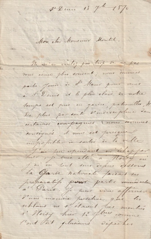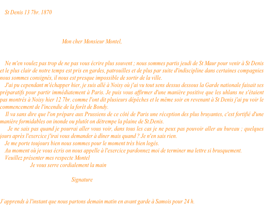 Cela va chauffer je le crains, les Prussiens semblent menacer le Mans : espérons que nous saurons les y recevoir – un ballon de Paris est arrivé aujourd’hui- la situation de Paris est excellente – enthousiasme universel à la nouvelle du succès d’Orléans Trochu prépare une grande sortie- pain et vin pour 6 mois- viande sans parler de chèvre jusqu’au 1er janvier nous battrons le prussien, j’en ai le ferme espoir :