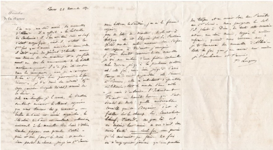 J’ai reçu, ma chère Marie, des nouvelles d’Alberic. Il a assisté à la bataille de Coulmiers : il s’en est tiré sain et sauf, c’était magnifique, écrit-il, c’était la 2eme fois que l’armée marchait aux ordres. Il était au près du général d’Aurelles avec une division de son escadron et a parfaitement vu tous les mouvements de la bataille. Malheureusement il n’a pas été compris dans les récompensés – mais je m’occupe de lui et j’espère bien parvenir à le faire décorer- je t’ai donné son adresse 15e corps (ancienne Brigade Michel) armée de la Loire.