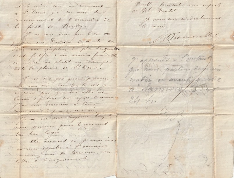 J’espère bientôt recevoir de tes nouvelles. Je vis au milieu d’une fièvre continuelle cela durera jusqu’à la prochaine victoire oh ! cette fois, nous irons jusqu’à Paris Fanny m’a écrit aujourd’hui elle s’ennuie à rennes ; elle m’entretient d’opérations militaires ; tous le monde s’en mêle. Je viens d’entendre l’Intendant Friant un honnête homme qui s’est évadé de Metz : quelle misérable canaille que ce Bazaine ! c’est à fusiller sur le champ lui, Canrobert, Lebœuf, Frossard – ces gens là ont vu dépérir leur armée à vue d’œil sans avoir tenté une seule fois une percée qu’ils auraient pu faire 20 fois on n’engagerait jamais qu’une partie des troupes et on avait soin de l’autre au premier succès. Nous purgerons le sol s’il plait à Dieu, de toute cette vermine ! adieu ma chère marie, toujours le même refrain, quand nous reverrons nous ? Je te donnerai des nouvelles d’Albéric toutes les fois que j’en aurai reçues.