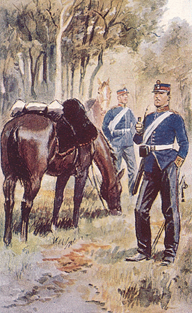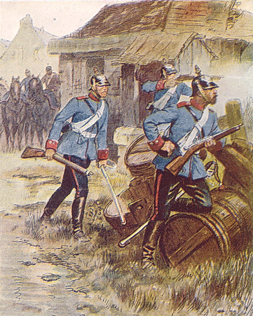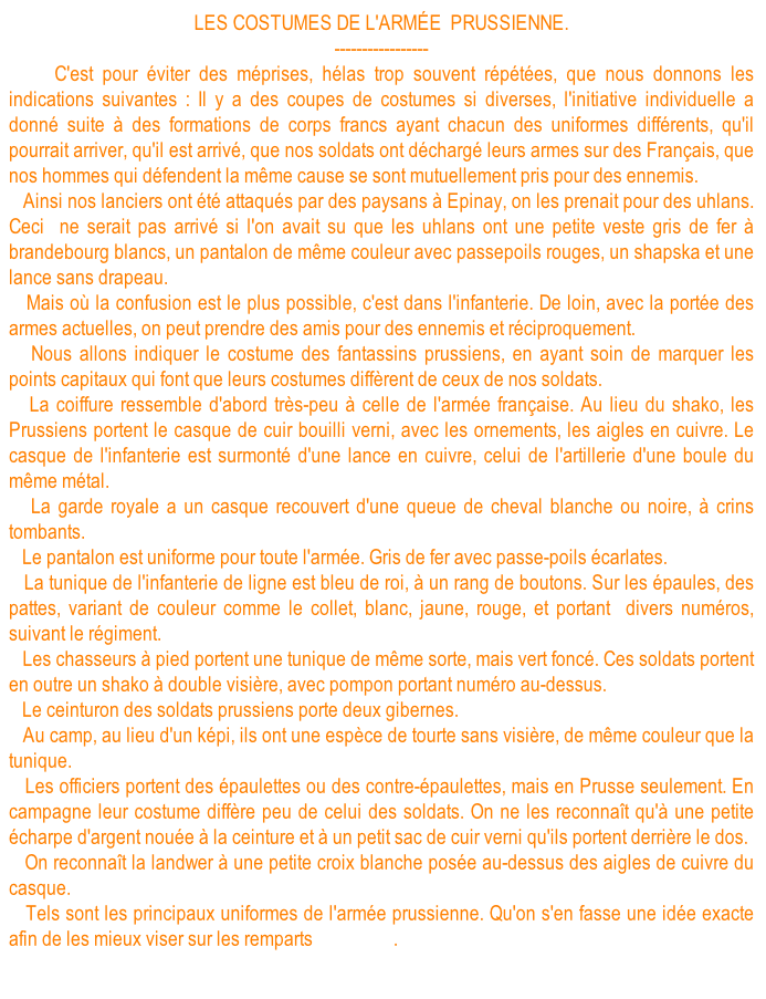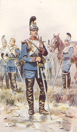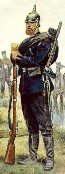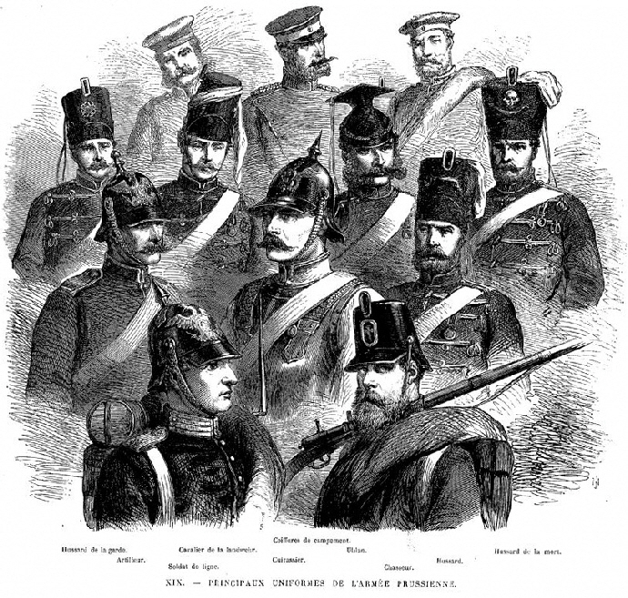 Chasseurs bavarois. Chasseurs de la landwehr et dragons prussiens. Chasseurs saxons et artilleurs prussiens. Cuirassier bavarois  et infanterie wurtembergeoise. Chevau-legers bavarois et dragons mecklembourgeois. Hussards et hussards de la mort. Ci-dessous la plaque"tête de mort" et la coiffure (le  kolback) spécifique de ces derniers cavaliers. Cuirassiers prussiens. Uhlan prussiens et cavalier saxon. Cuirassier et chasseur à pied bavarois, cuirassier et uhlan prussien   (Photos du musée de l'Armée de Paris). Retour vers le menu Retour vers la page d'accueil Artilleurs bavarois. "Vize-Koporal 4. chevauxlegers-Rgt König", officier de "chevau-légers " et uhlan bavarois. Coiffure de uhlans. Artilleurs saxons et génie prussien. Infanterie bavaroise. Infanterie prussienne. Casque"à chenille" bavarois,  plaque de casque bavarois et Casque de chasseur bavarois. Casque à pointe     mecklembourgeois. Casque saxon (haut) et prussien. Képi wurtembergeois. Coiffure (Mütze)  prussienne, d'officier, d'artilleur prussien et bavaroise. Casques  bavarois. "Glaive" porté par les soldats saxons. Casque  d'artilleur prussien. Casque de cavalier saxon. Motif de la plaque d'un ceinturon d’officier supèrieur bavarois Casque d'artilleur saxon. Voyez des uniformes prussiens et des différents états de la confédération allemande. Casque d'officier bavarois.